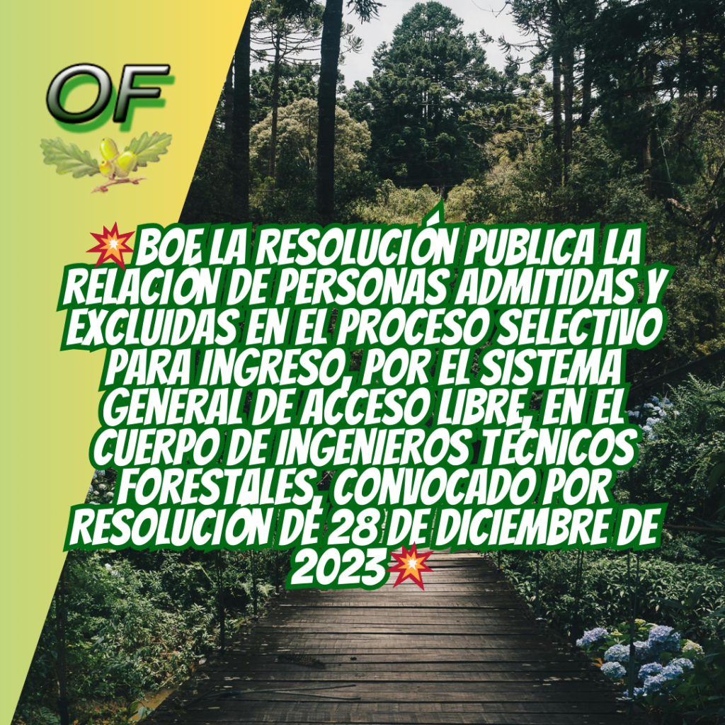 💥BOE la Resolución de 20 de febrero de 2024, de la Subsecretaría, por la que se publica la relación de personas admitidas y excluidas en el proceso selectivo para ingreso, por el sistema general de acceso libre, en el Cuerpo de Ingenieros Técnicos Forestales, convocado por Resolución de 28 de diciembre de 2023